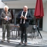 Leider ist St. Leonhard in einer umfangreichen Restaurierungsphase, sodass der erste Tagesimpuls nicht im Kirchengebäude stattfinden konnte. So werden einige organisatoriche Worte seitens der Veranstalter: Dr. Hans Prömper, Vertreter des Vorsitzs Hessische St. Jakobusgesellschaft i.G. draußen gehalten. Hier wurde, im Innenhof des Lebenshauses St. Leonhard, (Alte Mainzer Gasse 10) wurde die Staffelübergabe in Form eines geschmückten Kreuzes gemacht.