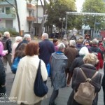 In Prozession mit dem Kreuz vorne weg aber ohne Gesang gehen wir vom Haus am Dom über die Alte Brücke über den Main zum Deutschorden (Brückenstr.3 in Sachsenhausen).
