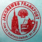 Im Haus am Dom erhalten wir einen Pilgerstempel in unseren ‘Credencial de Peregrinos’ und wer ihn nicht dabei hat, lässt sich in eine Broschüre stempeln. Ein schöner Stempel übrigens. Er zeigt in seiner runden Form die Kirche St. Leonhard und den Dom. Gekrönt von der Jakobsmuschel als Symbol eines jeden Pilgers. Diese drei Symbole sind umrandet mit dem Schriftzug: Jakobsweg Frankfurt – Dom St. Bartholomäus – St. Leonhard. Die Stempelfarbe ist rot und somit hebt sich dieser Stempel von den meisten anderen ab.